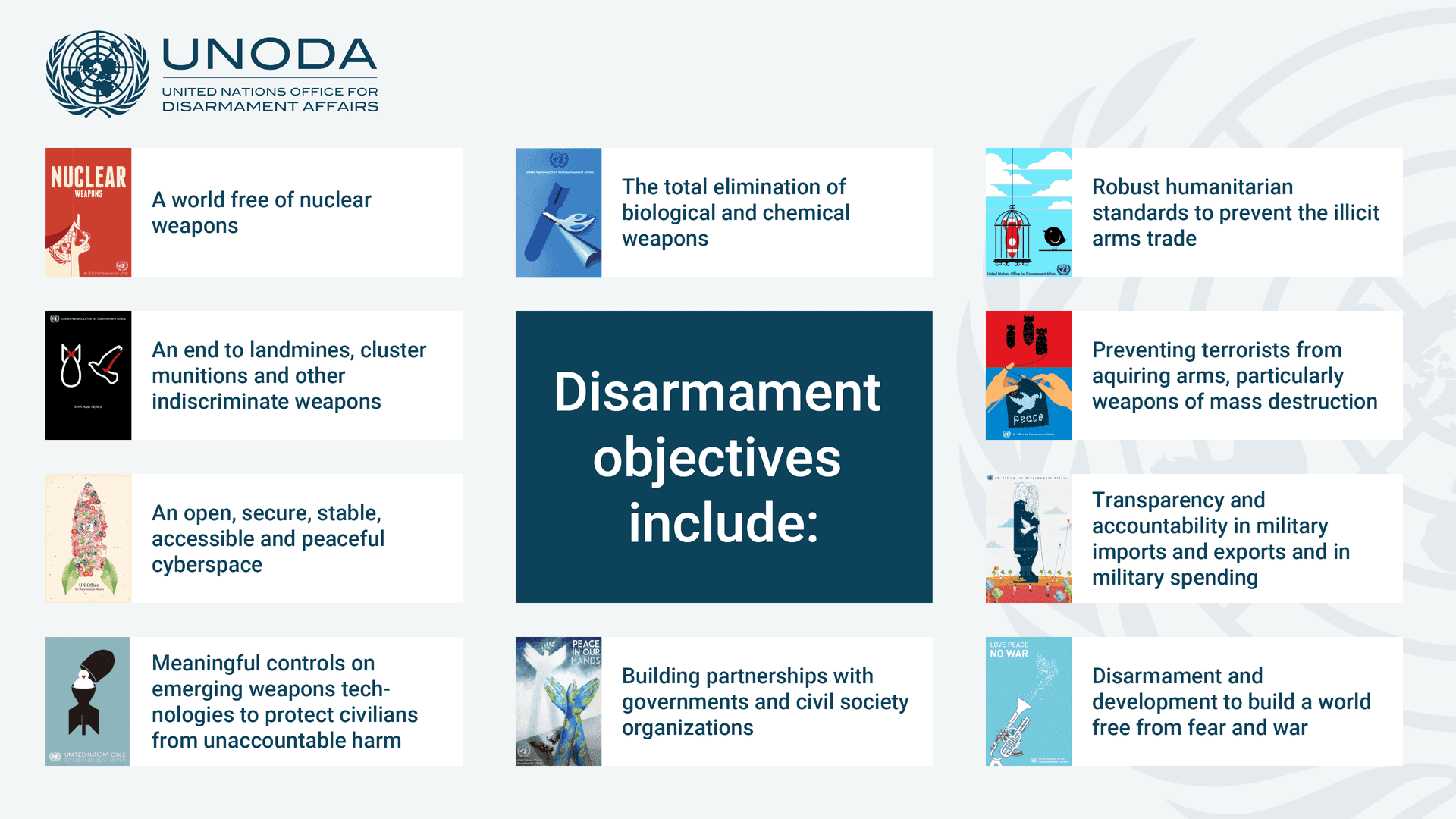 At this point, check out the many objectives of disarmament as described by UNODA. Especially look at the many fields where disarmament can be applied.